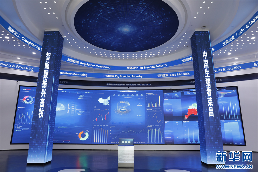国家级生猪大数据中心的大屏幕上,实时显示各地生猪交易数量、交易价格等数据。新华网发(资料图)