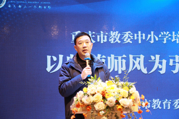 “以教育家精神引领高质量教师队伍建设和专业发展,擦亮专业发展底色、坚守专业发展本色、增添专业发展亮色,天台在行动。”活动最后,天台岗小学教育集团教师带来了朗诵《天台 师说》。重庆市教委师范教育处处长黄伟为大家作整区整校推进项目开班第一讲。