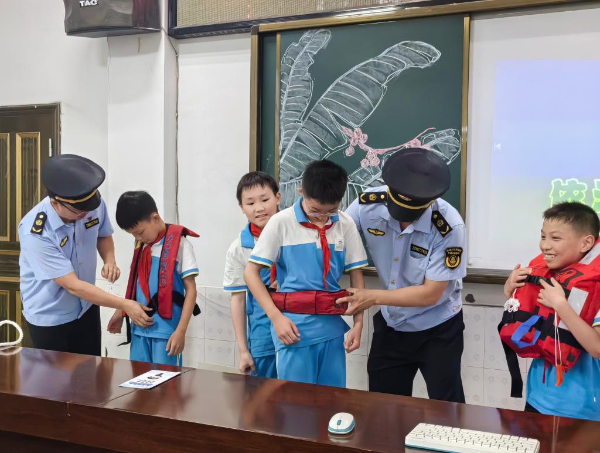 夏季来临,执法队员还针对水上交通安全进行宣传,手把手教同学们穿救生衣的正确方法,并通过互动问答,让大家更深入地了解玩水的注意事项:不独自到池塘边、河边或田间水沟玩水、嬉戏,不独自或和同伴去河边游泳等。