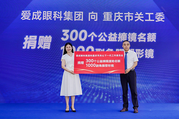 随后,渠浩代表爱成眼科集团向重庆市关工委捐赠300个高考生公益摘镜名额及1000副角膜塑形镜,以实际行动践行企业社会责任,助力近视考生圆梦,同时帮助更多近视青少年延缓近视发展。