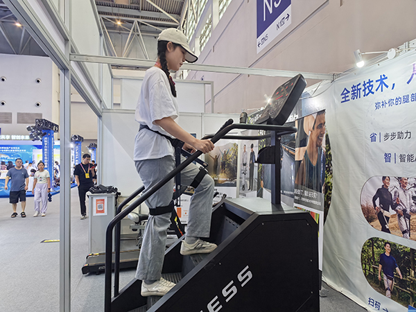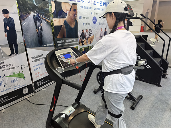 市民在跑步机上体验使用WIM智能助行外骨骼辅助爬坡。(葛琦 摄)