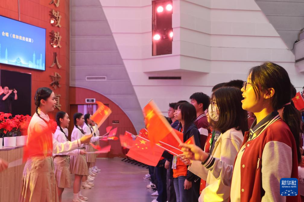 10月14日,香港金文泰中学师生与重庆市育才中学校师生合唱《我和我的祖国》。新华社记者 雷明宇 摄