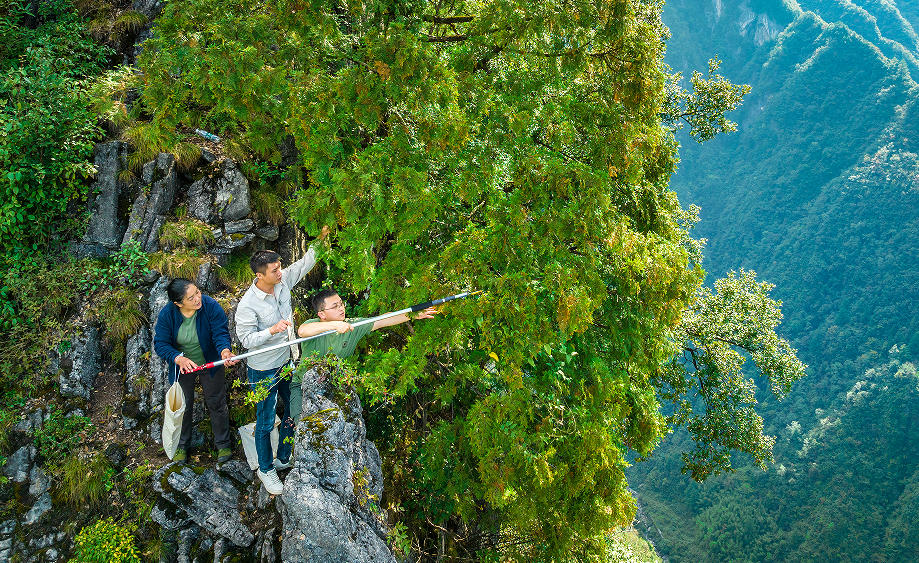 雪宝山青年团队在悬崖峭壁上采集崖柏种子。