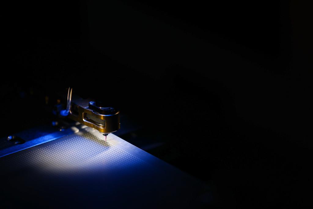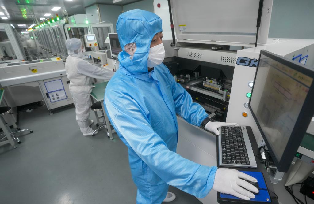 12月2日,在重庆新视通智能科技有限公司COB生产车间,工人在操作锡膏印刷设备。新华社发(李晓果摄)