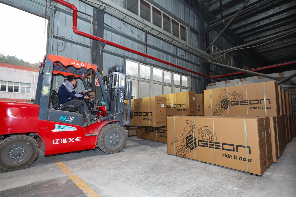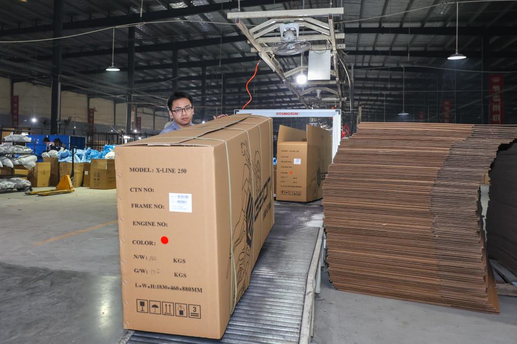 12月2日,在重庆炙焱动力制造有限公司,工人将打包好的摩托车码放整齐等待出口。该公司生产的摩托车主要出口至拉美、东南亚、欧洲等市场。