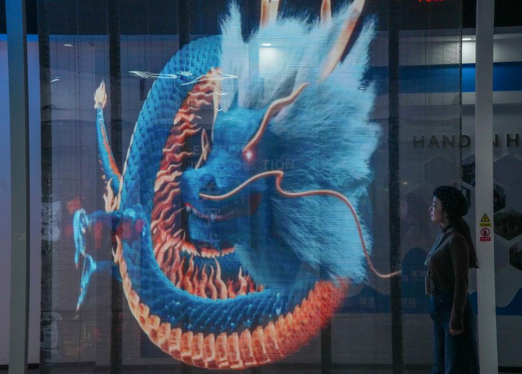 12月2日,在重庆新视通智能科技有限公司展厅内,工作人员在介绍LED成品。新华社发(李晓果摄)