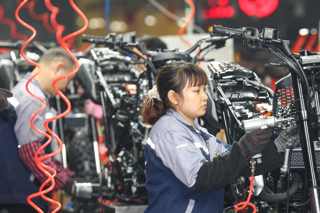 12月2日,在重庆炙焱动力制造有限公司,工人在生产线上组装出口的摩托车。新华社记者 黄伟 摄
