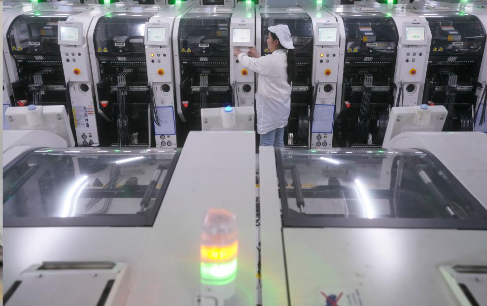 12月2日,在重庆新视通智能科技有限公司SMT(表面组装技术)生产车间,工人在操作自动贴片机。新华社发(李晓果摄)