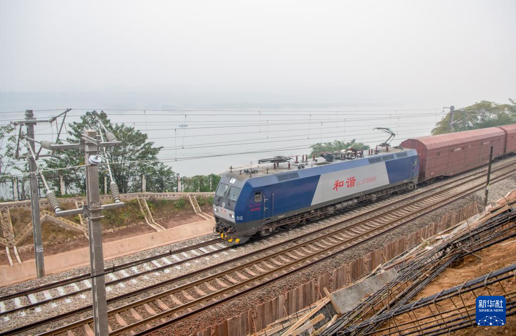 12月11日,列车在成渝铁路扩能改造工程黄磏至铜罐驿站区间通行。新华社记者 唐奕 摄