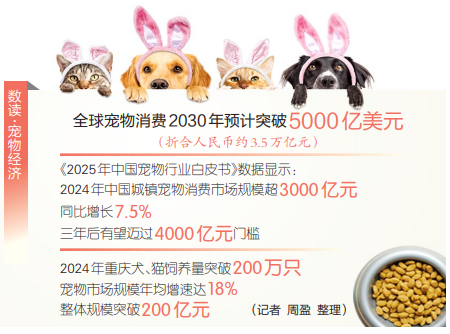 数据显示,2024年中国城镇宠物消费市场规模超3000亿元,“它经济”正加速崛起。作为全球第二大宠物消费市场,中国宠物经济超越“口粮、洗澡”等基础需求,衍生出宠物餐厅、智能用品、健康管理等多元业态。在重庆,充满活力的宠物经济浪潮同样经历着向“精细化”转型的深刻变革。