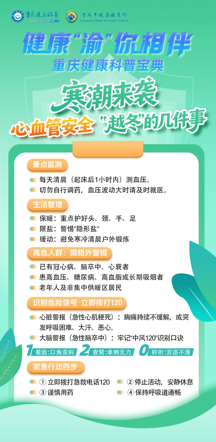 冬季心血管风险,始于寒冷触发的生理级联反应,其防控关键在于系统性且精准地主动防御。核心在于理解“冷应激”机制以知悉风险本源,严控“清晨血压”以稳固防御基石,并时刻保持对高危信号的高度警觉。望您能将此认知付诸实践,为自身与家人构筑一道坚实的健康屏障,安稳度过每一季寒冬。