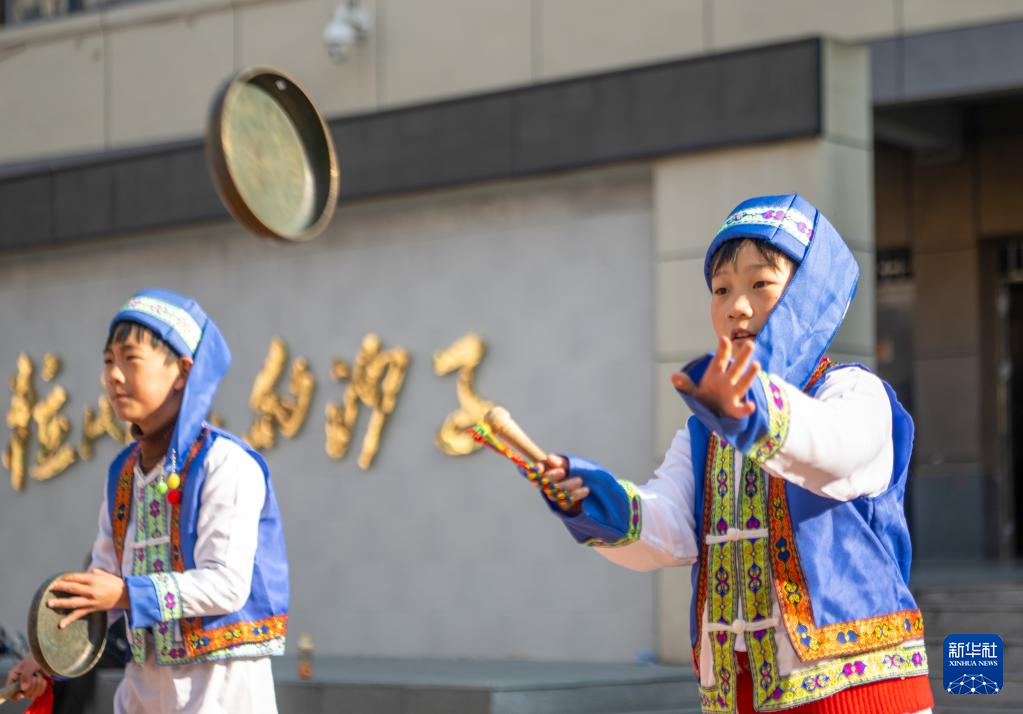 1月9日,石柱县沙子镇中心小学的学生在非遗代表性传承人的带领下练习“丢马锣”技艺。新华社记者 唐奕 摄