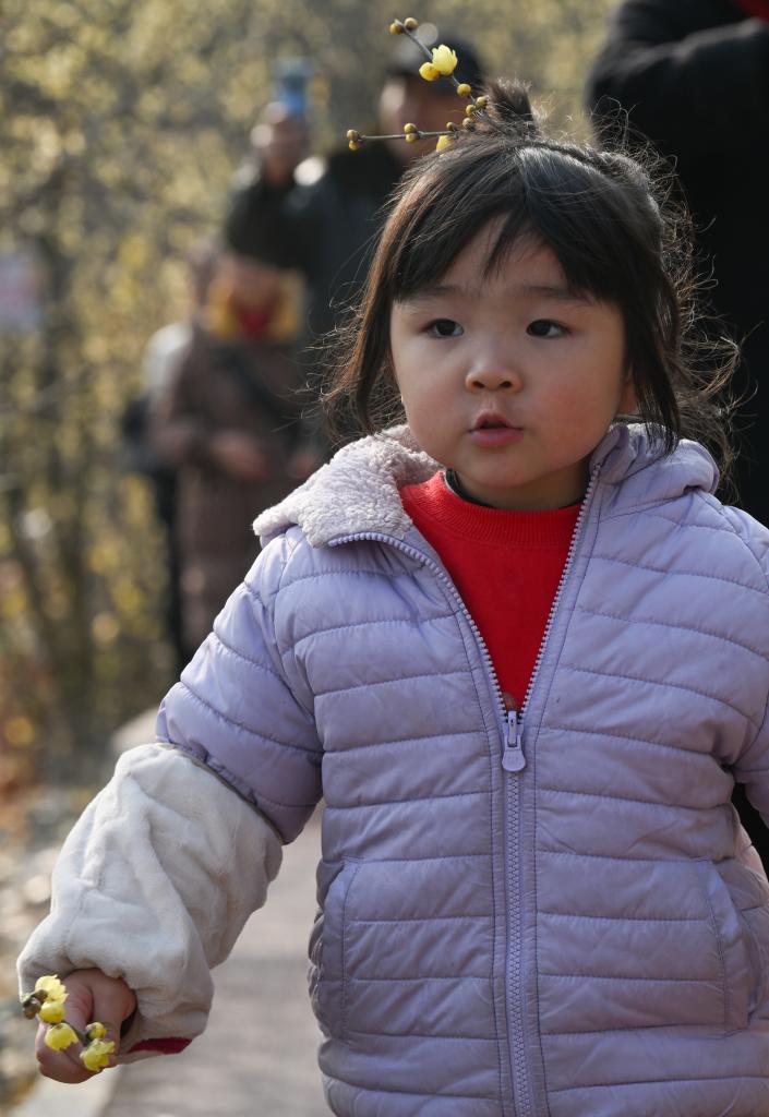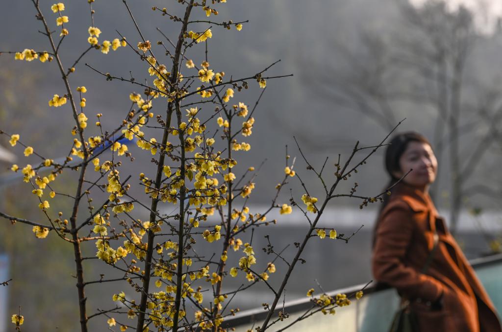 1月9日,游客在重庆市北碚区静观镇蜡梅博览园里游玩。