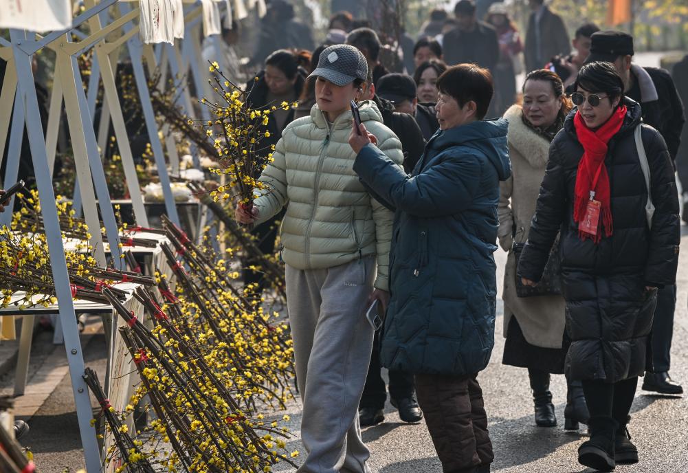 1月9日,游客在重庆市北碚区静观镇蜡梅博览园外选购蜡梅。