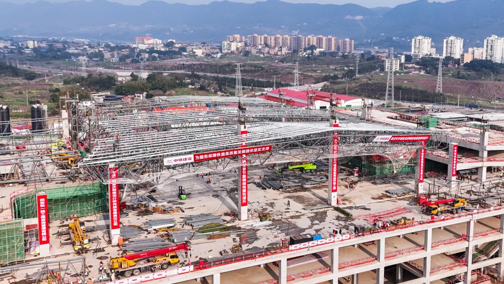1月26日,重庆科学城站站房钢结构屋盖正在进行提升作业。(无人机图片)