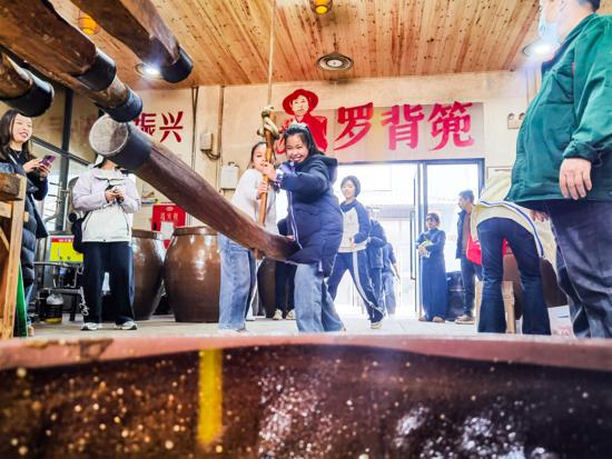 体验坊内,一根直径约1.2米的巨大古木横卧,其中段掏空的木槽里,炒熟压扁的菜籽饼被木楔徐徐挤压,清亮的菜籽油缓慢滴落。正是这样简单的撞击木棍插销的劳动体验,搭配沁人心脾的菜籽油天然清香,牢牢吸引游客排队体验、争相购买。