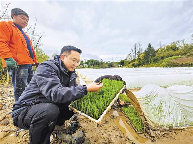 李世飞端着一盘秧苗查看生长情况。记者 彭瑜 摄\视觉重庆